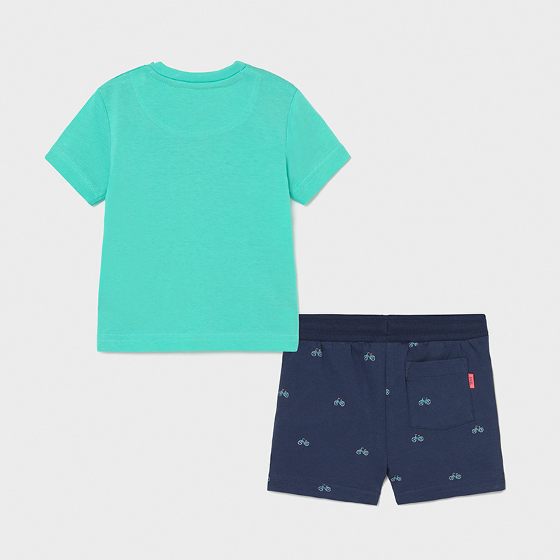 Mayoral σετ μακό μπλούζα και βερμούδα για νεογέννητο αγόρι έως 3 ετών. Μπλούζα κοντομάνικη με στρογγυλεμένο γιακά. Σε χρώμα άκουα με σχέδιο ποδήλατο στο μπροστινό μέρος. Κούμπωμα με κόπιτσες στον ώμο για να φοριέται εύκολα. Από 100% βαμβακερό ύφασμα μακό. Βερμούδα με λάστιχο και ρυθμιζόμενο κορδόνι στη μέση για καλύτερη εφαρμογή. Σε χρώμα μπλε με σχέδιο ποδήλατα. Τσέπες στο πλάι και στο πίσω μέρος. Από ελαστικό και βαμβακερό ύφασμα μακό.